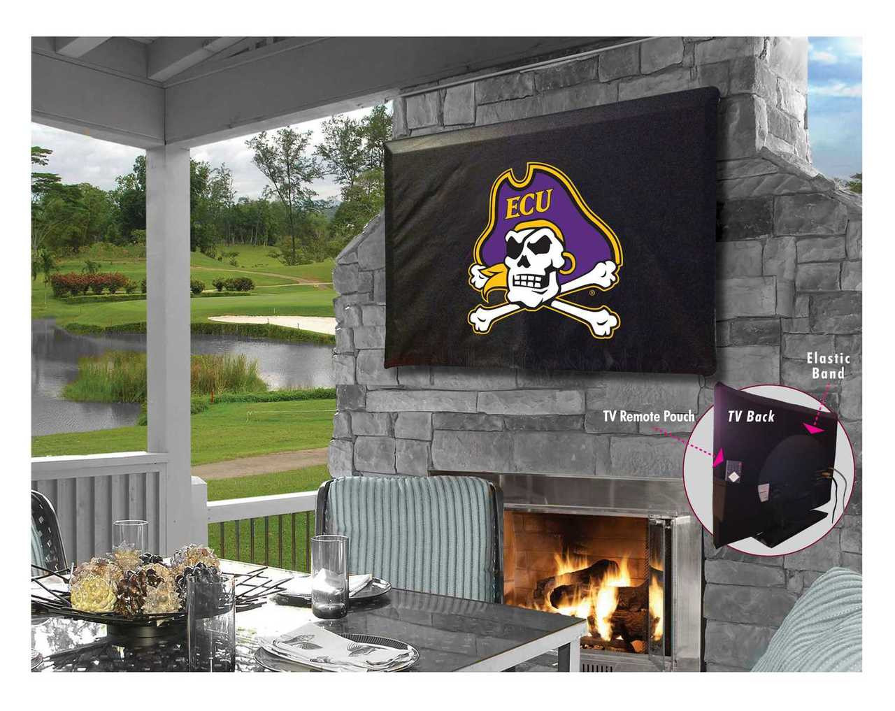This East Carolina TV Cover is hand-made in the USA using the finest commercial grade vinyl and utilizing a step-by-step screen print process to give you the most detailed logo possible. UV resistant inks are used to ensure exceptional durability to direct sun exposure. Spandex-like material wraps around the back of the TV, keeping moisture out while allowing heat out and helping to prevent overheating. Back opening allows a fit on any wall mount, and bungee allows cover to be cinched down securely. Cover also contains a pocket for remote control storage. This product is Officially Licensed, so you can show your pride while protecting your TV from the elements of nature. Keep your TV protected and support your team with the help of Covers ! Fits TV sizes 50" to 56".
