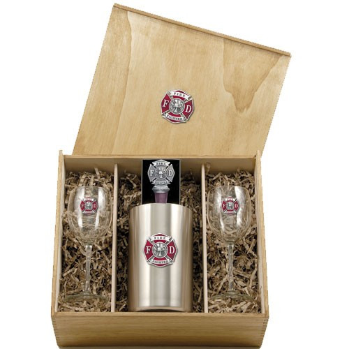 This boxed set contains one stainless steel wine chiller, two (12 ounce) glass goblets, and a bottle stopper. The wine chiller is double wall insulated and, along with the goblets, is embellished with a fine pewter casting. The bottle stopper is cast in solid fine pewter. The synthetic cork will not stain or crack. It comes equipped with a chain attached to a ring which goes around the bottle's neck. Made in USA.