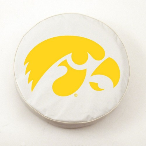 These great Iowa Hawkeyes large white tire covers are made with a heavy gauge vinyl that has an elastic tie down for an easy fit. It is a universal fit tire cover that fits tire diameter up to 31"x11". It's also water resistant, and wipes clean with a damp cloth.