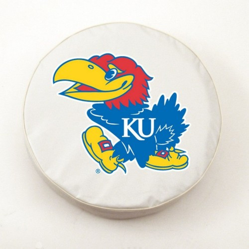 These great Kansas Jayhawks small black tire covers are made with a heavy gauge vinyl that has an elastic tie down for an easy fit. It is a universal fit tire cover that fits tire diameter up to 28 ? x 8. It's also water resistant, and wipes clean with a damp cloth.