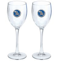 This is a set of two 12 ounce glass goblets with a fine pewter logo medallion bonded to the side. It could be used to serve water, wine or other beverages. Made in USA.