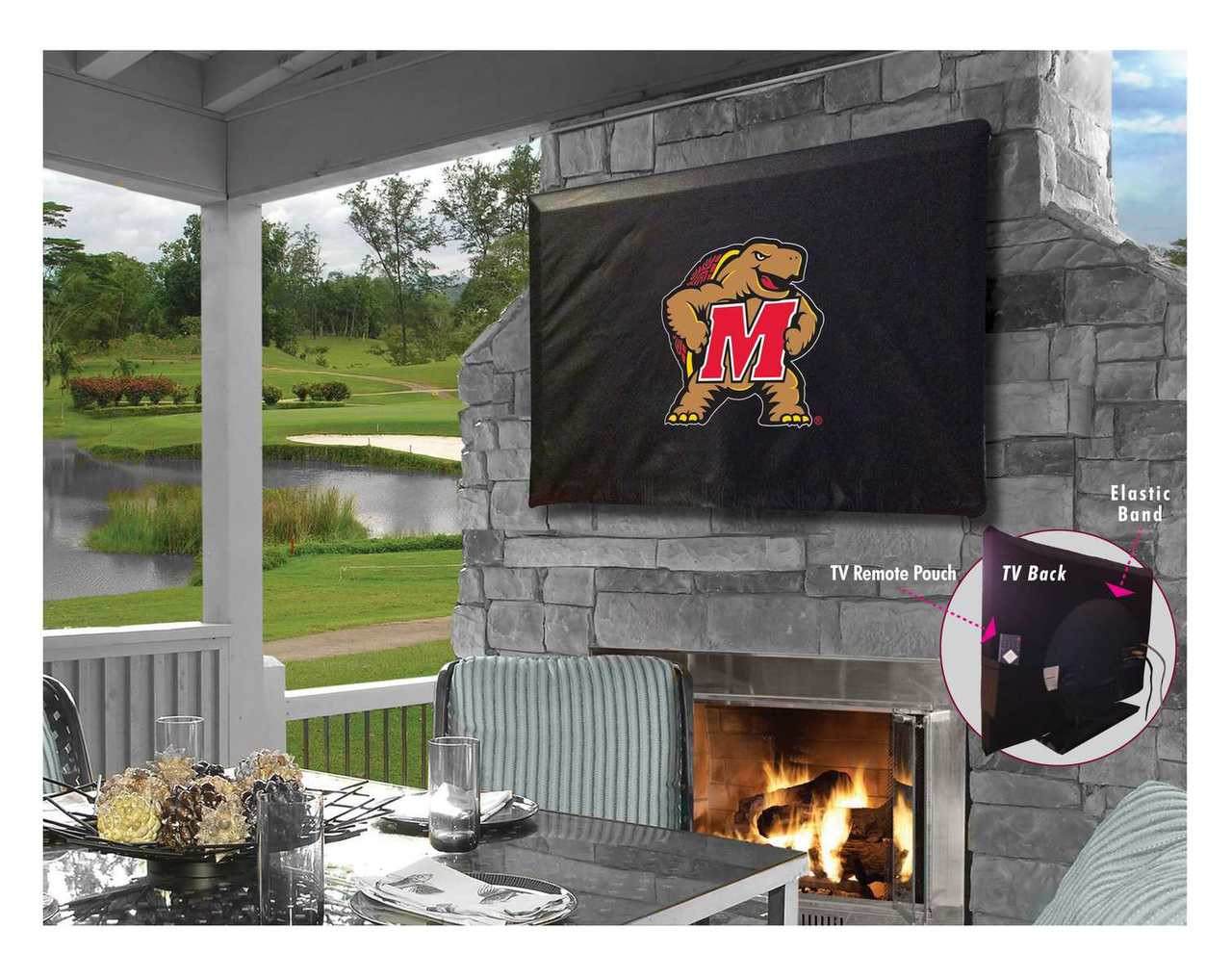 This Maryland TV Cover is hand-made in the USA using the finest commercial grade vinyl and utilizing a step-by-step screen print process to give you the most detailed logo possible. UV resistant inks are used to ensure exceptional durability to direct sun exposure. Spandex-like material wraps around the back of the TV, keeping moisture out while allowing heat out and helping to prevent overheating. Back opening allows a fit on any wall mount, and bungee allows cover to be cinched down securely. Cover also contains a pocket for remote control storage. This product is Officially Licensed, so you can show your pride while protecting your TV from the elements of nature. Keep your TV protected and support your team with the help of Covers ! Fits TV sizes 60" to 65".