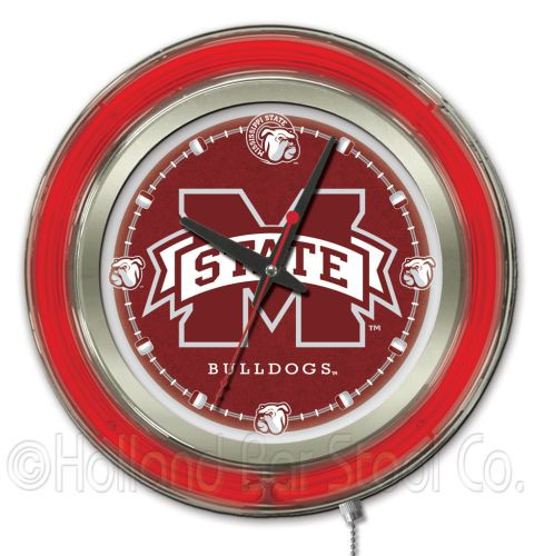 This Mississippi State Bulldogs Neon Clock is a perfect way to show your team pride. Chrome casing and a team specific neon ring accent a custom printed clock face, lit up by an brilliant white, inner neon ring.