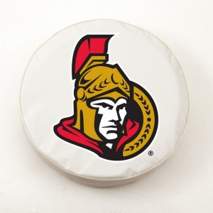 These great Ottawa Senators small white tire covers are made with a heavy gauge vinyl that has an elastic tie down for an easy fit. It is a universal fit tire cover that fits tire diameter up to 28 ? x 8. It's also water resistant, and wipes clean with a damp cloth.