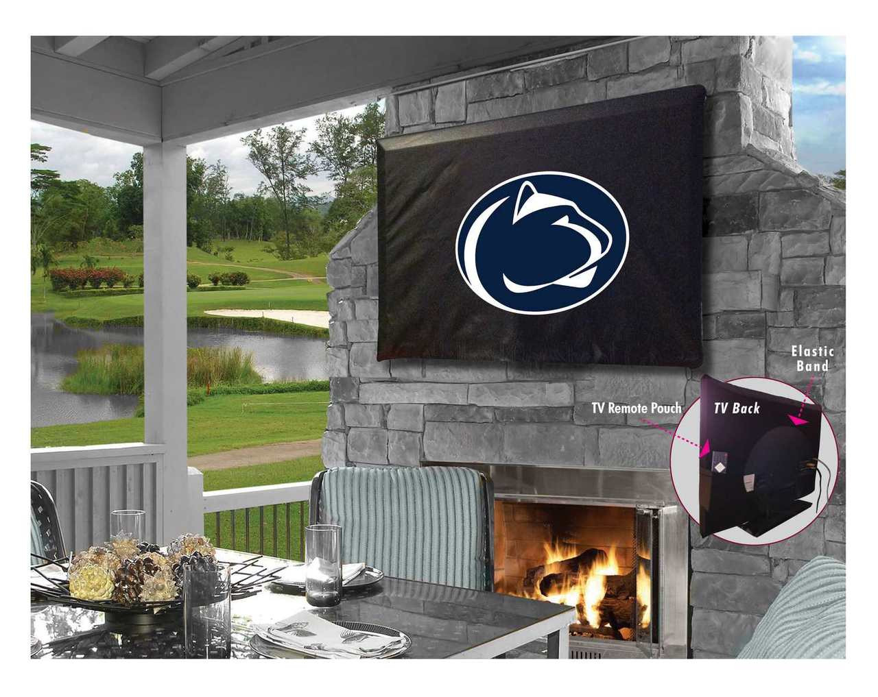 This Penn State TV Cover is hand-made in the USA using the finest commercial grade vinyl and utilizing a step-by-step screen print process to give you the most detailed logo possible. UV resistant inks are used to ensure exceptional durability to direct sun exposure. Spandex-like material wraps around the back of the TV, keeping moisture out while allowing heat out and helping to prevent overheating. Back opening allows a fit on any wall mount, and bungee allows cover to be cinched down securely. Cover also contains a pocket for remote control storage. This product is Officially Licensed, so you can show your pride while protecting your TV from the elements of nature. Keep your TV protected and support your team with the help of Covers ! Fits TV sizes 60" to 65".