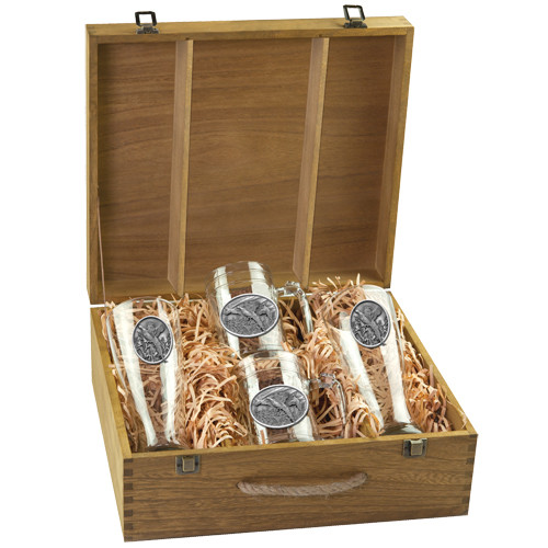 This boxed set contains two (20 ounce) glass pilsners and two (15 ounce) steins. Each is embellished with a fine pewter casting.