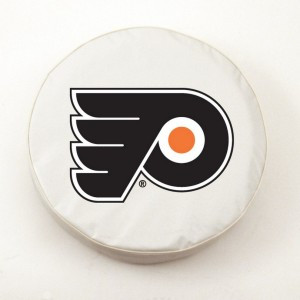 These great Philadelphia Flyers large white tire covers are made with a heavy gauge vinyl that has an elastic tie down for an easy fit. It is a universal fit tire cover that fits tire diameter up to 31"x11". It's also water resistant, and wipes clean with a damp cloth.