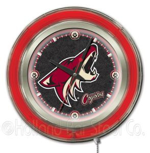 This Phoenix Coyotes Neon Clock is a perfect way to show your team pride. Chrome casing and a team specific neon ring accent a custom printed clock face, lit up by an brilliant white, inner neon ring.