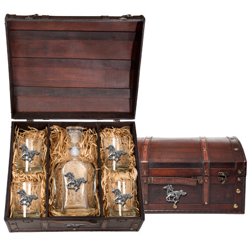 This chest boxed set contains one 24 ounce glass decanter and four (14 ounce) double old fashioned glasses. Each is embellished with a fine pewter casting.