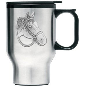 This double wall stainless steel quarter horse travel mug is insulated and it is stainless inside and out. It is embellished with a fine pewter decorative casting. The lid has a non-spill feature. 14 oz.