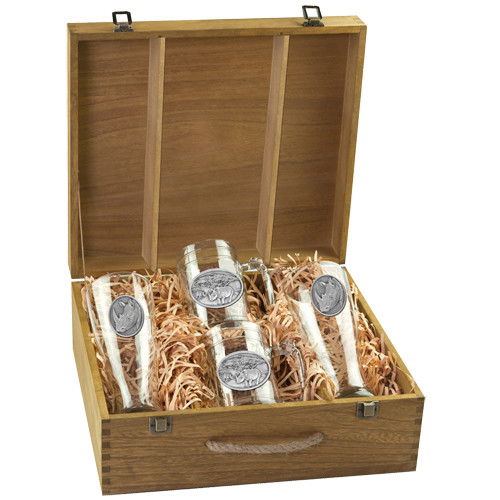 This boxed set contains two (20 ounce) glass pilsners and two (15 ounce) steins. Each is embellished with a fine pewter casting.