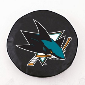 These great San Jose Sharks small black tire covers are made with a heavy gauge vinyl that has an elastic tie down for an easy fit. It is a universal fit tire cover that fits tire diameter up to 28 ? x 8. It's also water resistant, and wipes clean with a damp cloth.