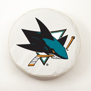 These great San Jose Sharks small white tire covers are made with a heavy gauge vinyl that has an elastic tie down for an easy fit. It is a universal fit tire cover that fits tire diameter up to 28 ? x 8. It's also water resistant, and wipes clean with a damp cloth.
