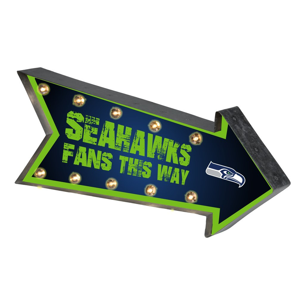 These light up arrow marquee signs have a classic old school look and design. Made of metal construction and featuring 10 light up bulbs to showcase the team name and colors. Battery operated with on/off switch so there is no cord hanging down the wall. These marquee signs make a perfect gift for any sports fan! Measures approximately 18" x 7" x 2".