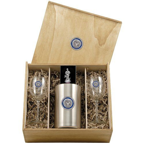 This boxed set contains one stainless steel wine chiller, two (12 ounce) glass goblets, and a bottle stopper. The wine chiller is double wall insulated and, along with the goblets, is embellished with a fine pewter casting. The bottle stopper is cast in solid fine pewter. The synthetic cork will not stain or crack. It comes equipped with a chain attached to a ring which goes around the bottle's neck. Made in USA.