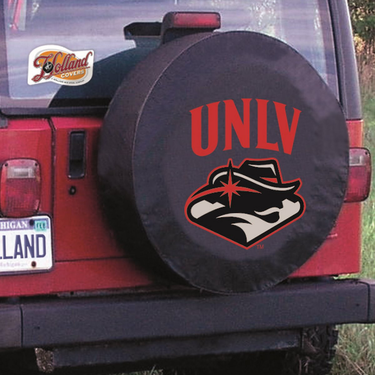 These great UNLV Rebels small black tire covers are made with a heavy gauge vinyl that has an elastic tie down for an easy fit. It is a universal fit tire cover that fits tire diameter up to 28 ? x 8. It's also water resistant, and wipes clean with a damp cloth.
