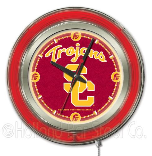 This USC Trojans Neon Clock is a perfect way to show your team pride. Chrome casing and a team specific neon ring accent a custom printed clock face, lit up by an brilliant white, inner neon ring.